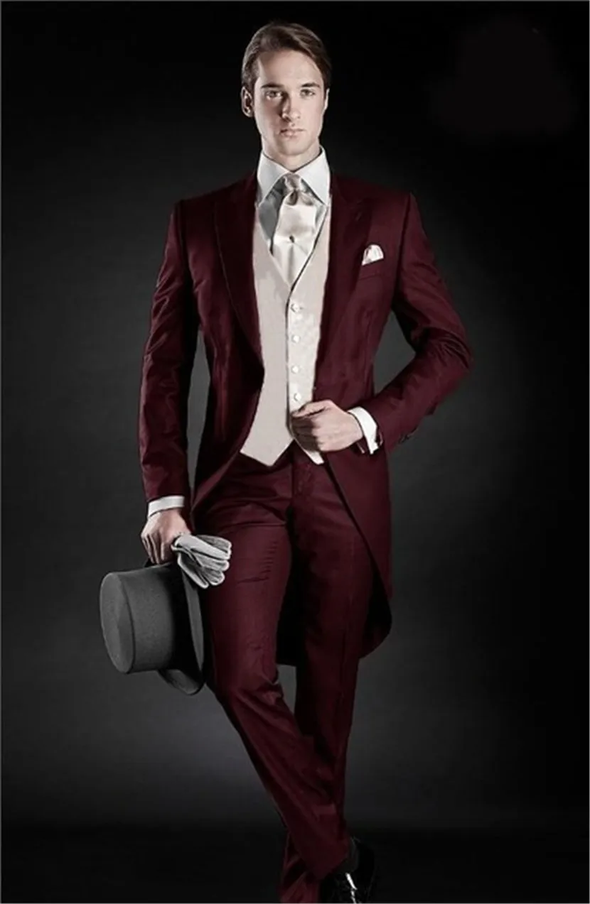 Best Offer of 2019 Morning Style Groom Tuxedos Peak Lapel Men's Suit Burgundy Groomsman/Best Man Wedding/Dinner S